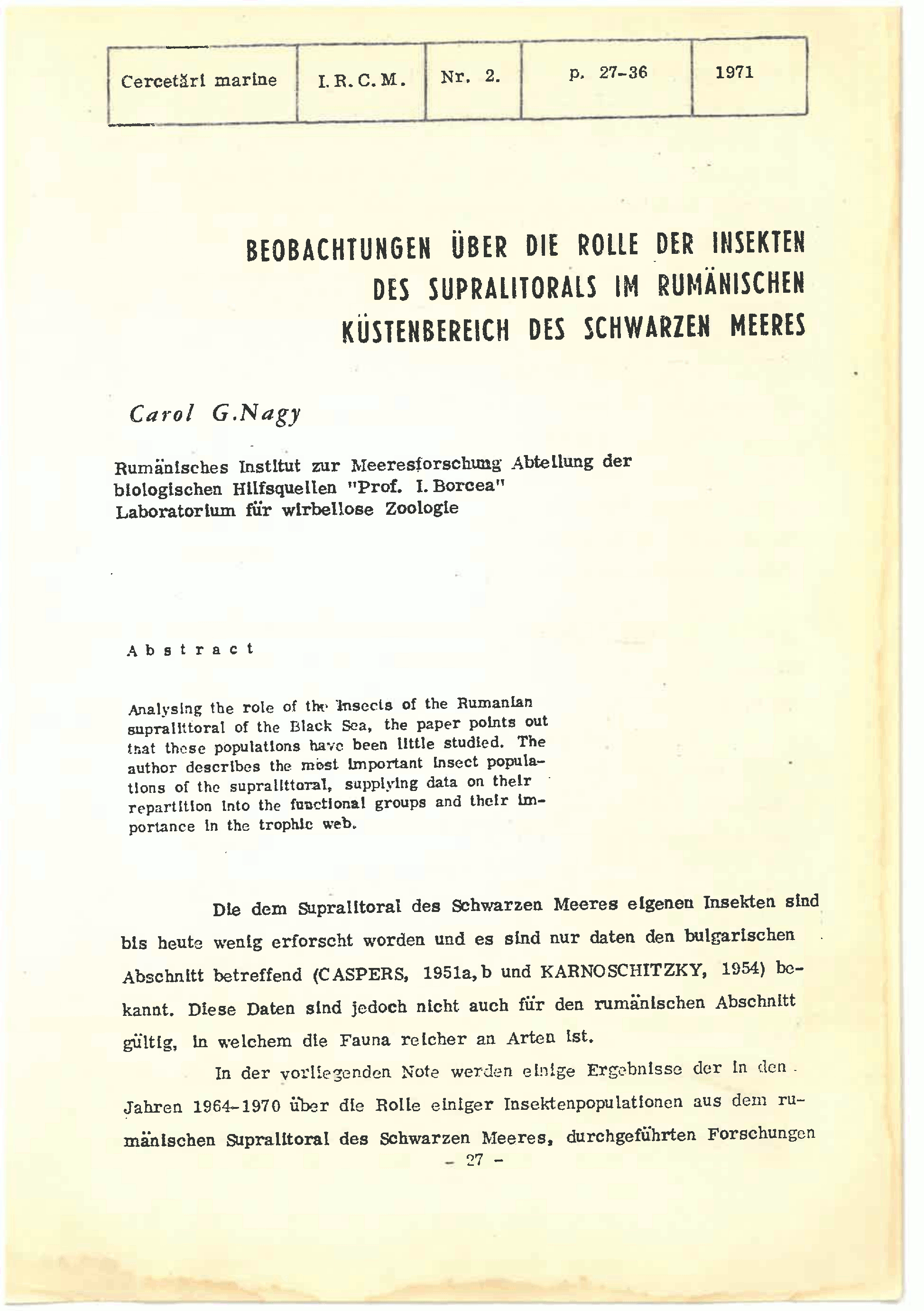 BEOBACHTUNGEN UBER DIE ROUE DES INSEKTEN DES SUPRAIITORA15 IM RUMANISCHEH KUSTENBEREICII DES SCHWARZEM MEERES