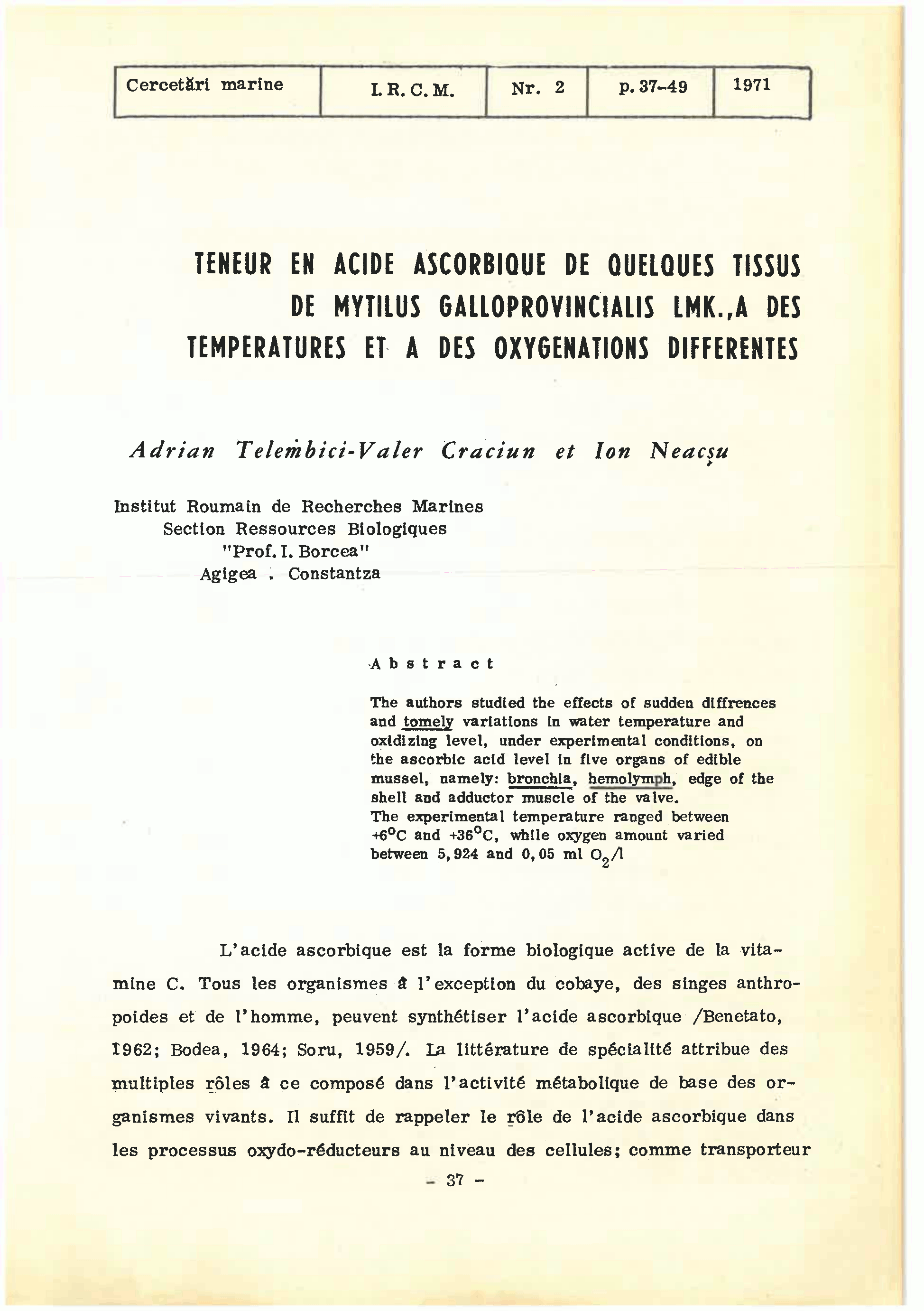 TENEUP EN ACIDE ASCORBIQUE DE QUELOUES TISSUS DE MVTILUS GALLOPROVINCIALIS LMK., A DES TEMPERATURES ET A DES OXYGENATIONS DIFFERENTES