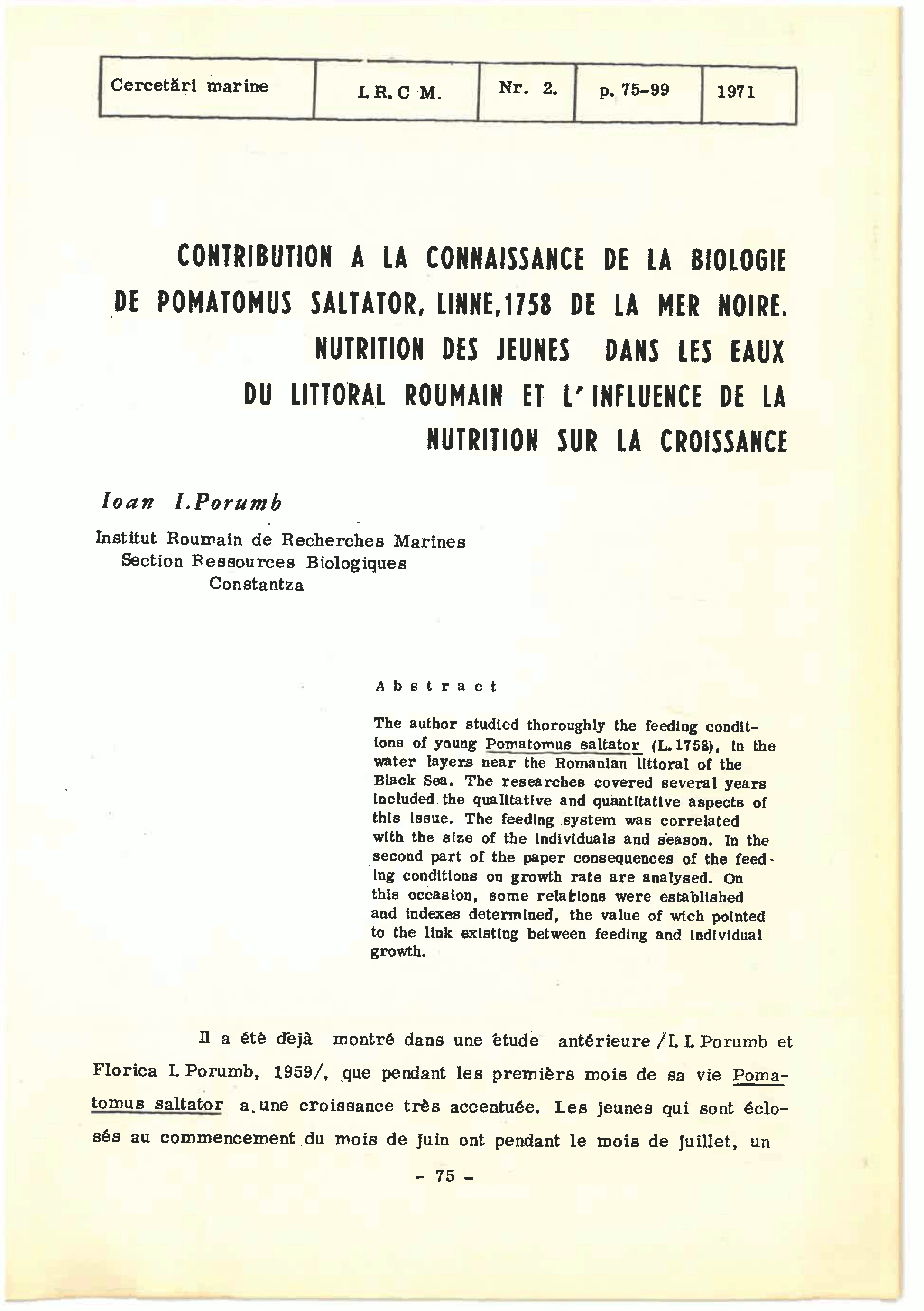 CONTRIBUTION A LA CONNAISSANCE DE LA BIOLOGIE DE POMATOMUS SALTATOR, LINNE.1758 DE LA MER NOIRE. NUTRITION DES JEUNES DANS LES EAUX DU LITTORAL ROUMAIN ET L' INFLUENCE DE LA NUTRITION SUR LA CROISSANCE