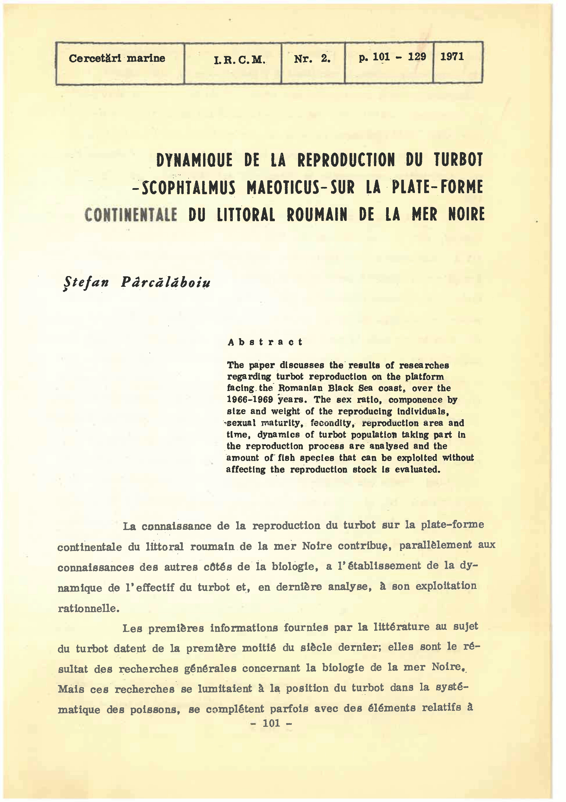 DYNAMIOUE DE LA REPRODUCTION DU TURBOT - SCOPHTALMUS MAEOTICUS - SUR LA PLATE-FORME CONTINENTALE DU LITTORAL ROUMAIN DE LA MER NOIRE