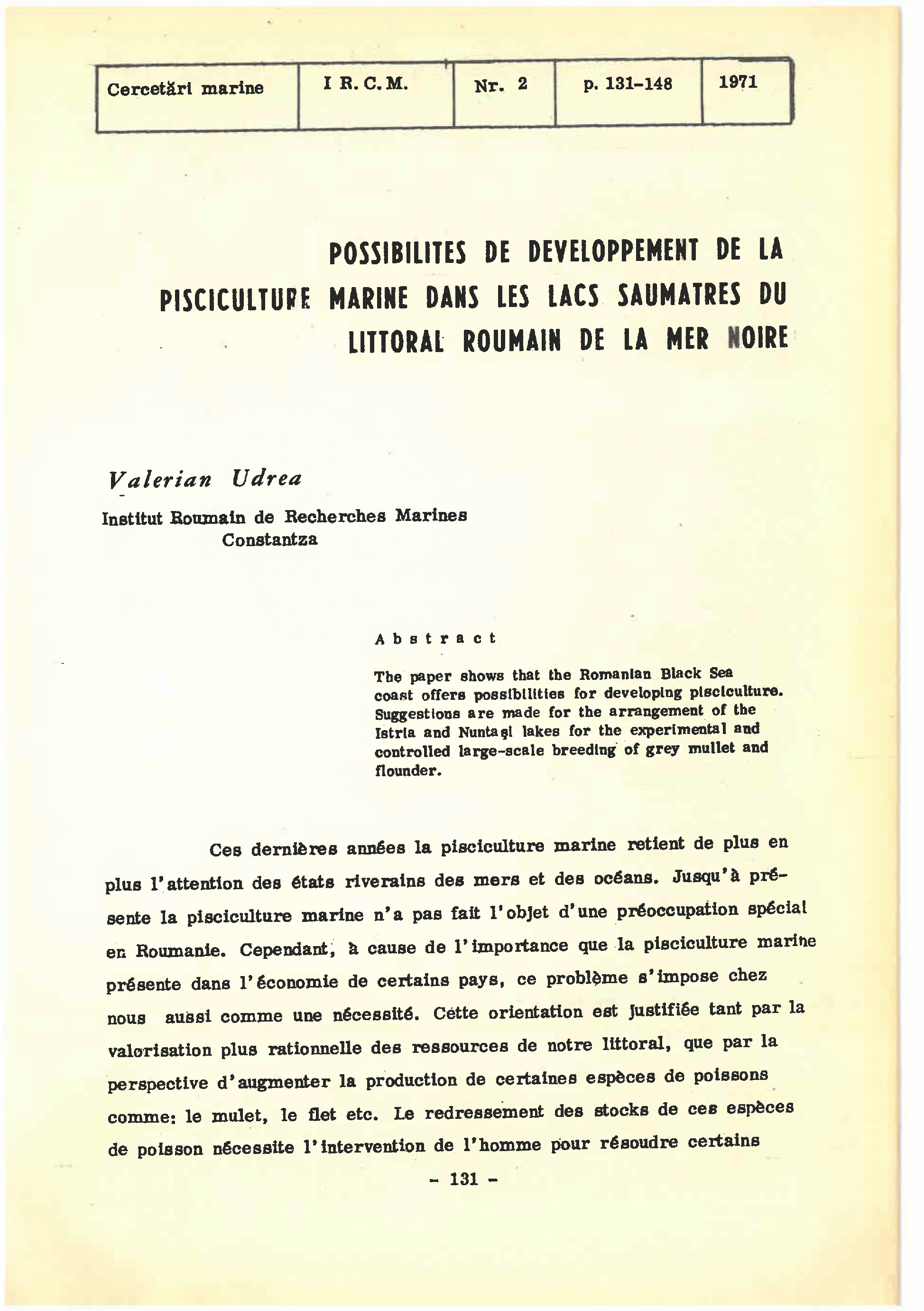 POSSIBILITES DE DEVELOPPEMENT DE LA PISCICULTURE MARINE DANS LES LACS SAUMATRES DU LITTORAL ROUMAIN DE LA MER NOIRE