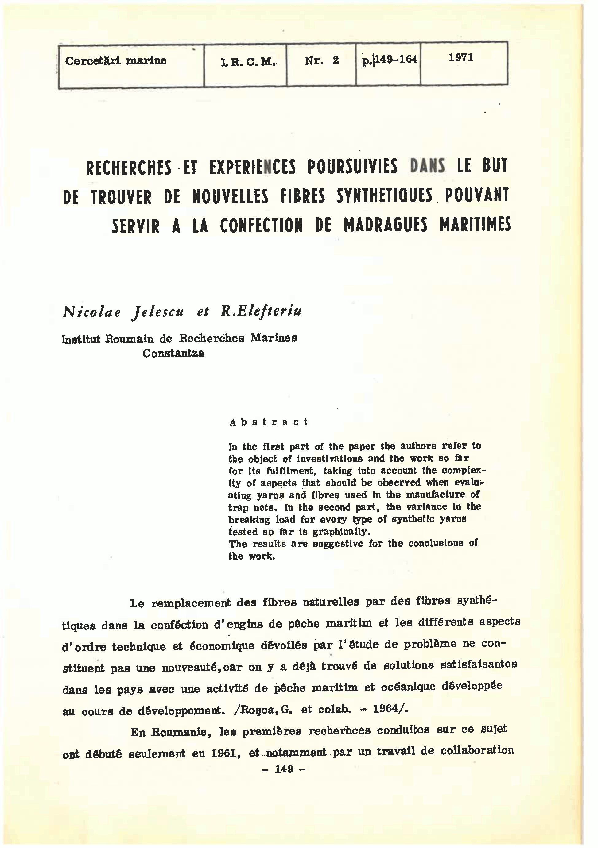 RECHERCHES ET EXPERIENCES POURSUIVIES DANS LE BUT DE TROUVER DE NOUVEUES FIBRES SYNTHETIQUES POUVANT SERVIR A LA CONFECTION DE MADRAGUES MARITIMES
